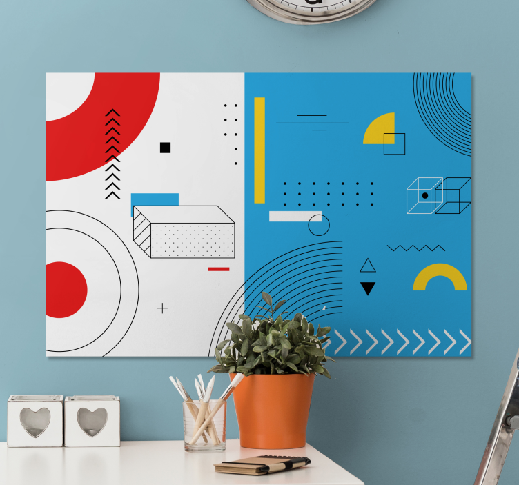 Fedezze fel a Geometriai formák kompozíció vászonra lenyűgöző világát, ahol az absztrakt elemek találkoznak a geometria szépségével! A tervezésben megjelennek a kör, háromszög, téglalap, nyilak, pontok és a minták különleges összhangja, amely azonnal magával ragadja a figyelmet, és egyedi hangulatot teremt bármely térben!