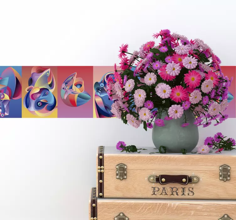 Fedezze fel az Absztrakt színes formák határok matrica lenyűgöző világát, ahol a modern dizájn találkozik a játékos geometriai formákkal! Ez a matrica állatos motívumokkal díszített, színes és absztrakt elemeket tartalmaz, amelyek friss és vidám hangulatot varázsolnak otthonába. Az élénk színek és a kreatív formák garantáltan feldobják a teret, és egyedi stílust kölcsönöznek a falaknak!