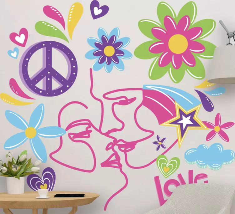 A Békés virág szívek matrica dekoráció egy igazán lenyűgöző és élénk grafikai tervezés, amely tele van szeretettel és békével. Színes virágok, szívek és vonalas rajzok találkozása hozza létre ezt a romantikus és játékos szimbólumot, ami tökéletesen illik bármilyen városi környezetbe.