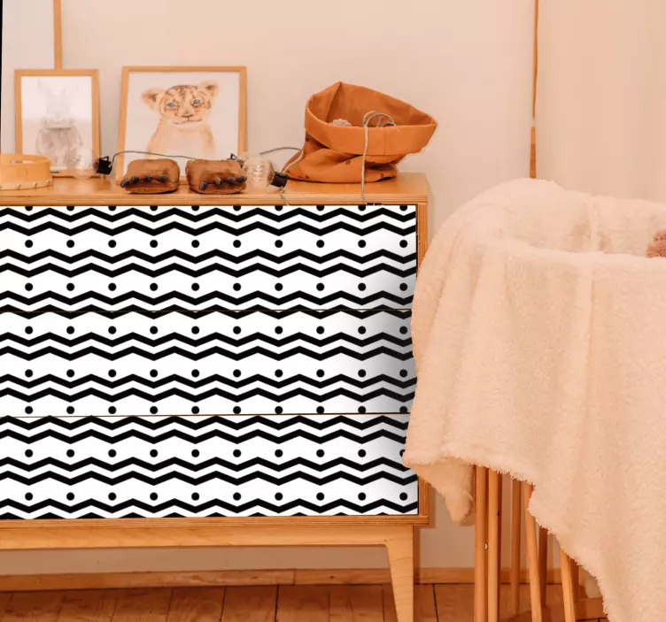 Fedezze fel a Chemvron minta stílus bútor matrica lenyűgöző világát, ahol a fekete és fehér cikcakk mintázat elegánsan és modern módon ötvözi a geometriai formákat. A vonalak és vonalak játékos ritmusával ez a bútor matrica tökéletes választás, ha valami különlegeset keres a lakásába.