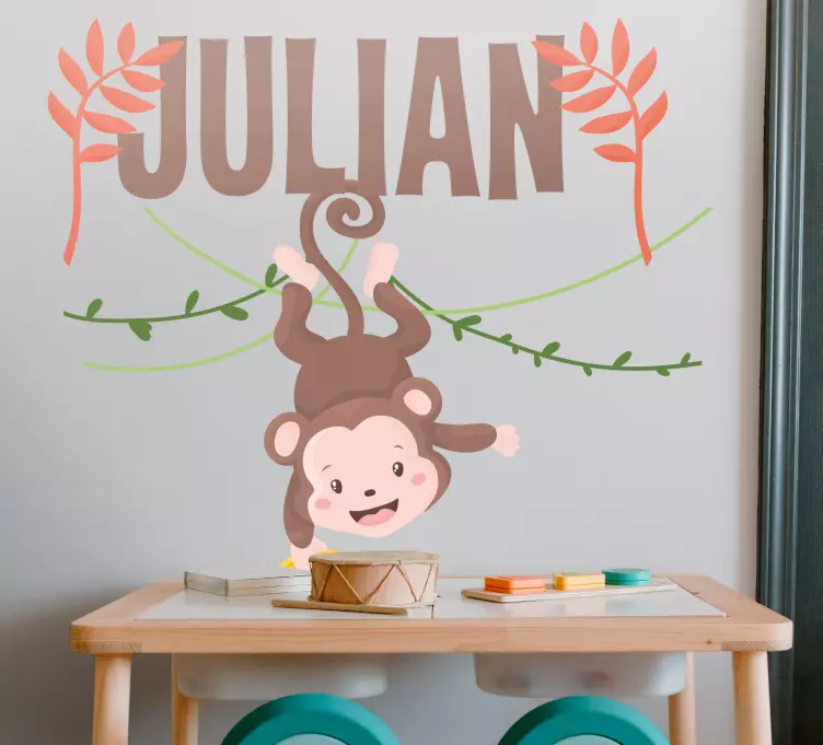 Hivatkozás: A49357Egy bájos dizájn, amelyen egy aranyos majom lóg fejjel lefelé egy indáról. A dizájn élénk leveleket tartalmaz, és lehetőséget kínál a személyre szabásra, így tökéletes gyerekeknek szánt helyiségekbe. A majom játékos arckifejezése vidám hangulatot ad bármilyen környezethez.