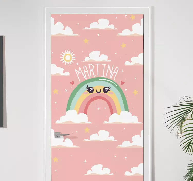 %Cím%Az öntapadó matrica grafikai tervezése színes felhőkkel és egy csodás szivárvánnyal készült, ami igazán aranyos és szórakoztató megjelenést kölcsönöz. Ezen egyedi ajtómatrica személyre szabott névvel varázsolja el a gyerekszobát vagy bármilyen más teret, ahol a napfény és a jókedv uralkodik!