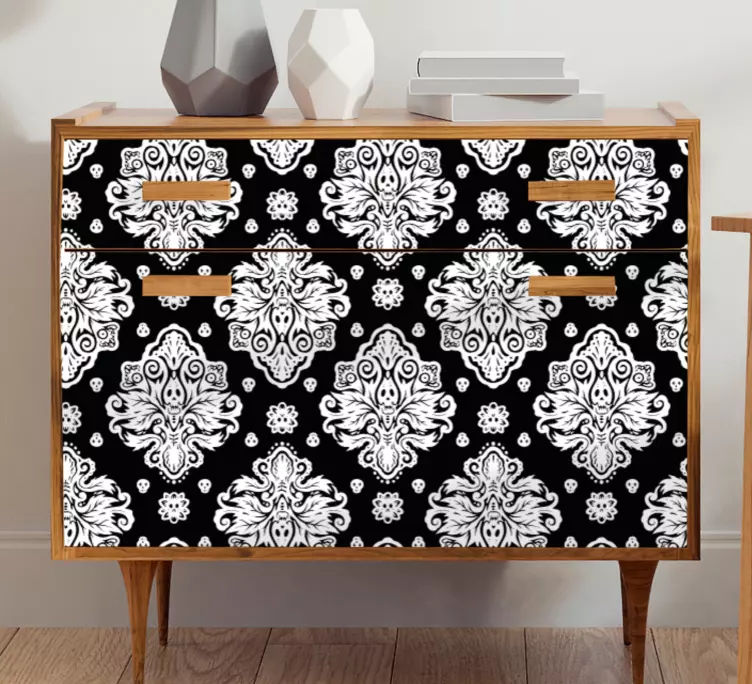 Fedezze fel az Elegáns mintázat betét bútor matrica varázslatos világát, ahol a modern stílus és a klasszikus díszítések találkoznak! Ez a különleges bútor matrica fekete és fehér színű, díszes mintákkal, amelyek között koponyák és virágok is megjelennek, így igazi műalkotást varázsolhat otthonába. A damaszt hatás eleganciát és egyediséget kölcsönöz a bútorainak, mindig lenyűgözve a vendégeit!
