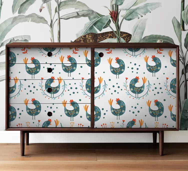 Fedezze fel az Élénk kakas illusztráció bútor matrica varázslatos világát, ahol a csirkék és más állatok játékos mintákkal és virágos elemekkel kelnek életre. Ez a színes dizájn tökéletesen illik bármilyen bútorhoz, feldobva a teret és vidám hangulatot teremtve. A termék kiemelkedő grafikai megjelenése mindenkit lenyűgöz, aki belép a helyiségbe!