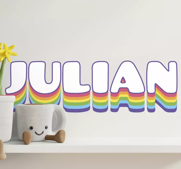 Hivatkozás: A47266Ez a színes névtervezés játékos, vibráló szivárványhatást mutat a betűkön. Minden karakter zökkenőmentesen integrálja a spektrumot, így barátságos légkört teremt. Ideális egy gyermek terének személyre szabására, vidám hangulatot kölcsönözve, miközben lehetőséget ad az egyéniség kifejezésére.