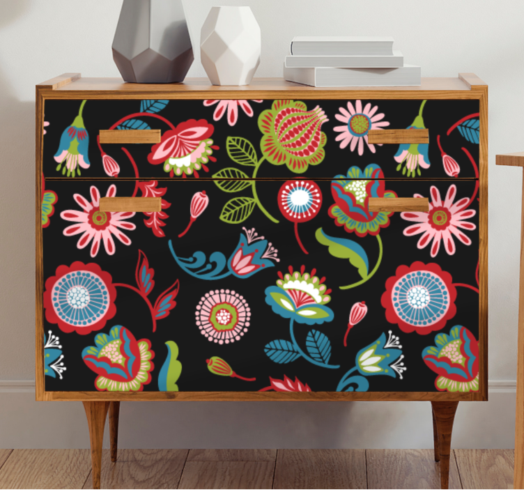 Fedezze fel a Élénk virágmintás matrica dekoráció varázslatos világát, ahol a virágos és színes motívumok harmonikusan keverednek a természet szépségével! Ez a dekoratív minta tökéletes választás minden bútorhoz, hiszen a virágok népi stílusa egyedi hangulatot kölcsönöz otthonának. A színek vibráló játéka és a részletes kidolgozás igazi ékessége lehet bármely helyiségnek.