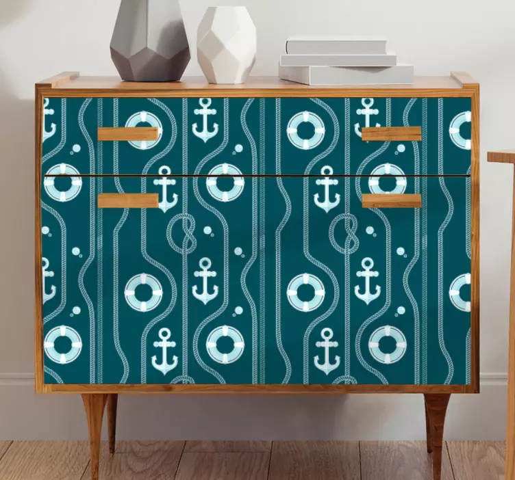 Fedezze fel a Horgonyok és bóják matrica dekoráció varázslatos világát, ahol a tengeri motívumok életre kelnek! A grafikus terv a tengeri horgony és bója minták harmonikus összhangját tükrözi, amely tökéletesen illeszkedik a kék és fehér színekhez. Ez a különleges dekoráció egyedülállóan feldobja bármely bútor felületét, miközben friss, tengerészies hangulatot varázsol az otthonába.