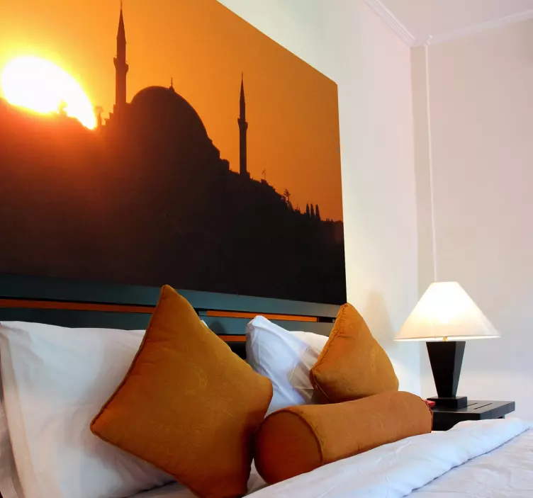 A Istanbul naplemente siluett - erdei állatok falmatrica egy lenyűgöző grafikai megjelenítést kínál, amelyben a naplemente színei gyönyörűen keverednek a város ikonikus mecseteivel és minaretjeivel. A sötét árnyalatokban megjelenő sziluettek között a vallási építészet és a természet harmóniáját tükrözik, miközben a pulykák és más erdei állatok színesítik a tájat, valódi műalkotást varázsolva a falra.