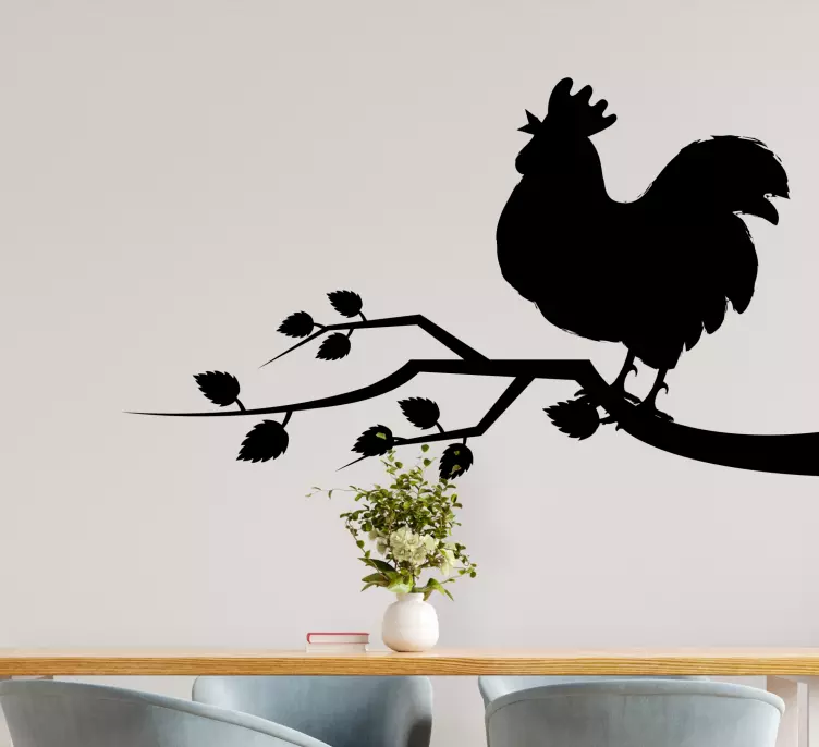 Hivatkozás: A49034Egy figyelemfelkeltő kakas sziluettje ül egy ágon, harmonizálva a természet és a farm életének elemeit. Az ágat díszítő levelek organikus érintést adnak, fokozva a dizájn rusztikus hangulatát, ideálissá téve bármilyen tér vidéki bájának megteremtésére.