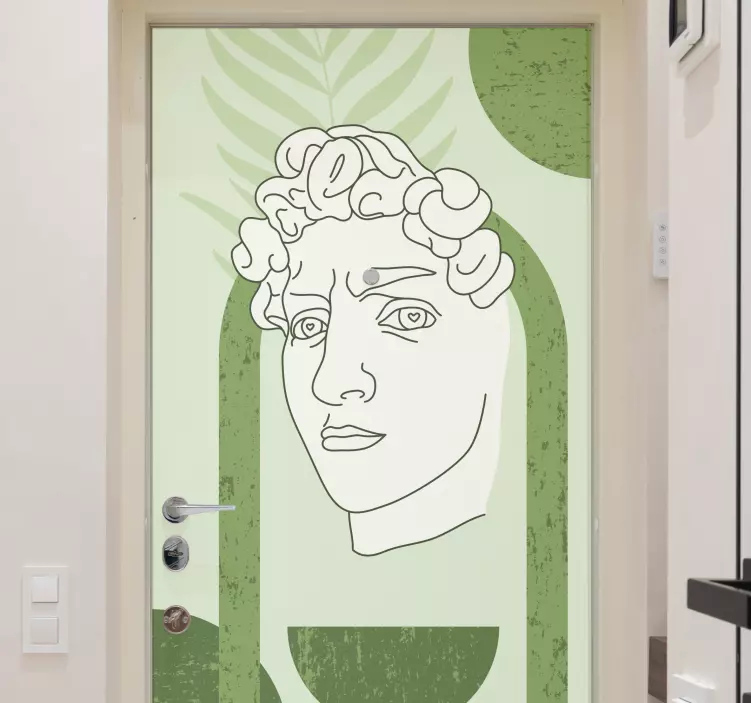 %Cím%Fedezd fel az egyedi öntapadó ajtómatricát, amely a dávid szobor minimalista ábrázolásával és modern designjával díszíti otthonod! Az absztrakt formák és a zöld tónusok tökéletes harmóniát alkotnak, miközben a vonalas rajzok eleganciát sugallnak. Ezzel a grafikai tervezéssel az ajtód nem csupán egy átjáró lesz, hanem művészi kifejezés is!