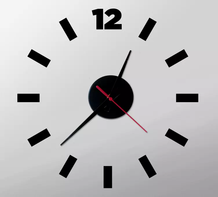 A Modern minimalista óra matrica dizájnja tökéletesen ötvözi a minimalista és modern stílust. A fekete és piros színek dinamikus eleganciát kölcsönöznek az órának, míg a csíkok és a tizenkét órás elrendezés egyszerű, mégis vonzó megjelenést biztosít. Ez a grafikai kialakítás nemcsak esztétikai értéket képvisel, hanem funkcionális célt is szolgál: az idő gyors és kényelmes megtekintését.