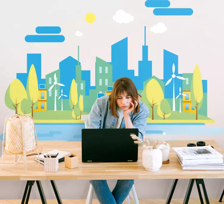 Fedezd fel a modern városi táj varázsát az erdei állatok falmatrica segítségével! A grafikus tervezés egyedi városkép sziluettjeit ötvözi felhőkarcolókkal, épületekkel, fákkal és vízfelületekkel. Az ábrázolt tájban a napfény romantikus hangulatot teremt, míg a szélturbinák a fenntarthatóság szimbólumai. Ez a falmatrica nemcsak dekoráció, hanem egy életérzés is!