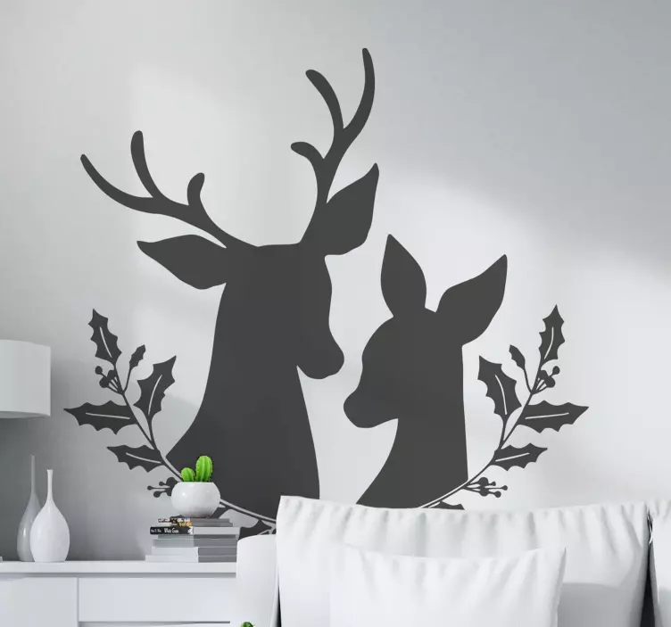 Hivatkozás: A46840Két szarvas bájos ábrázolása, bonyolult agancsokkal és kedves kifejezésekkel, fagyöngyágakkal keretezve. Ez a dizájn a természethez való kapcsolódás és a melegség érzését kelti, tökéletesen alkalmas bármely tér átalakítására egy nyugodt és hívogató környezetté.