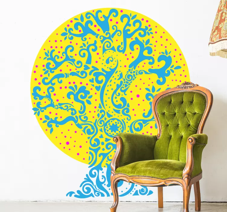 A Színes díszes fa természet matrica egy lenyűgöző művészeti alkotás, amely a természet szépségét hozza el otthonába. A design kör alakú elemekből áll, amelyek színes pontokban és szerves formákban jelennek meg. Ez a termék tökéletesen tükrözi az életet és a természet varázsát, így bármilyen környezetbe illeszkedik.