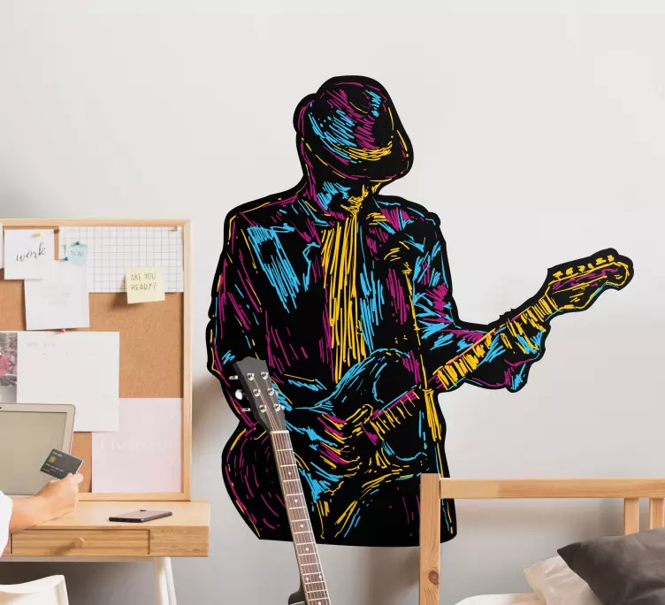 Fedezze fel a Színes gitáros siluett - matrica zenei csodálatos világát! Ez a lenyűgöző grafikai tervezés egy vibráló férfi gitárost ábrázol, aki éppen zenél. Az élénk színek és a dinamikus sziluett tökéletesen megjeleníti a zene iránti szenvedélyt, legyen szó elektromos gitárról vagy más hangszerekről. Ez a termék nemcsak a zenészeknek szól, hanem mindenki számára, aki szeretné otthonát egyedi módon díszíteni!