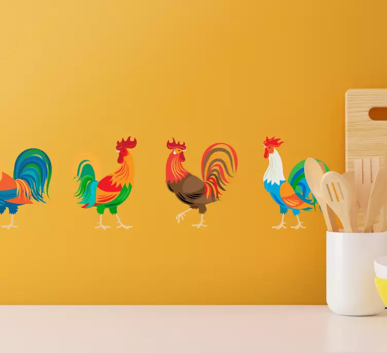 Fedezze fel a Színes kakas kiállítás határok matrica lenyűgöző világát, ahol a kakas és a kakasok színes ábrázolása tökéletesen illeszkedik a farm és konyha dekorációjába. Ez a termék élénk színeivel és figyelemfelkeltő grafikájával igazi szemet gyönyörködtető, amely bármilyen teret feldobhat!