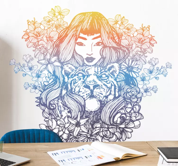 A Tigris nő - matrica emberek és karakterek lenyűgöző grafikájával és gazdag színvilágával azonnal magára vonja a figyelmet. A kelta motívumok és a női tigris karaktere egyedi virágos háttérrel találkozik, amely vonalas rajzok és merész színek kombinációjával kelti életre a dizájnt. Az elegáns gradiens háttér és a virágok harmonikus együttese igazán különleges dekorációs lehetőséget kínál.