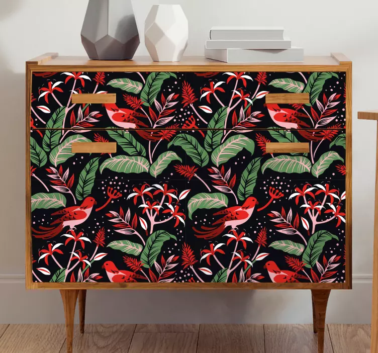Hivatkozás: A53481Egy élénk trópusi virágminta, amely piros madarakat és dús zöld leveleket ábrázol sötét háttér előtt. A design különböző virágos elemeket kombinál élénk színekkel, így energikus és friss légkört teremt, tökéletesen alkalmas arra, hogy egy kis természetet csempésszen bármilyen környezetbe.