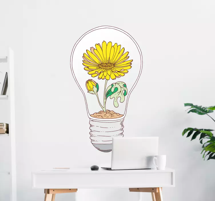 Fedezze fel a természet varázslatos világát a Virágzó izzó - erdei állatok falmatrica segítségével! Ez a lenyűgöző design egy izzó körte, napraforgó, levelek és virágok harmonikus összhangját ábrázolja, amely a fény és szín robbanásával mesés élményt nyújt. A sárga árnyalatok és a természetes elemek egyedi koncepciót alkotnak, ami tökéletesen illik bármely otthonba vagy irodába.