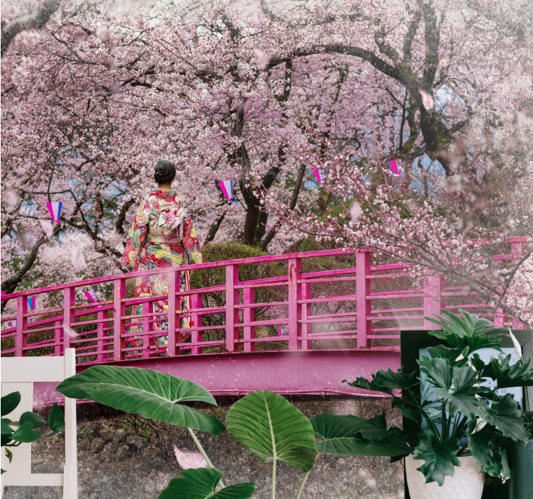 Hivatkozás: F12031A cseresznyevirágok teljes virágzását nyugalmasan ábrázoló kép, amely egy hagyományos alakot keretez egy rózsaszín hídon. A finom rózsaszín virágok nyugodt légkört teremtenek, amit a körüli színes díszítések fokoznak, megtestesítve a természet és a kultúra szépségét.