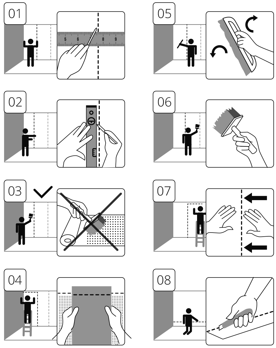 * A ragasztó száradási folyamata miatt nem ajánlott alacsony páratartalmú vagy 10ºC-nál alacsonyabb hőmérsékletű helyiségekben alkalmazni a tapétát. A felhelyezés és a száradási folyamat szempontjából a legideálisabb teremhőmérséklet 18-21ºC közt van.