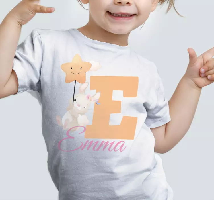 Hivatkozás: T4701Ez a bájos dizájn egy vidám nyuszit ábrázol, aki egy csillag lufit tart a kezében, mellette az 'E' betű és egy személyre szabott név található. Tökéletes különleges alkalmakra, sugárzik az öröm és a játékosság, így ideális választás a kicsik számára.
