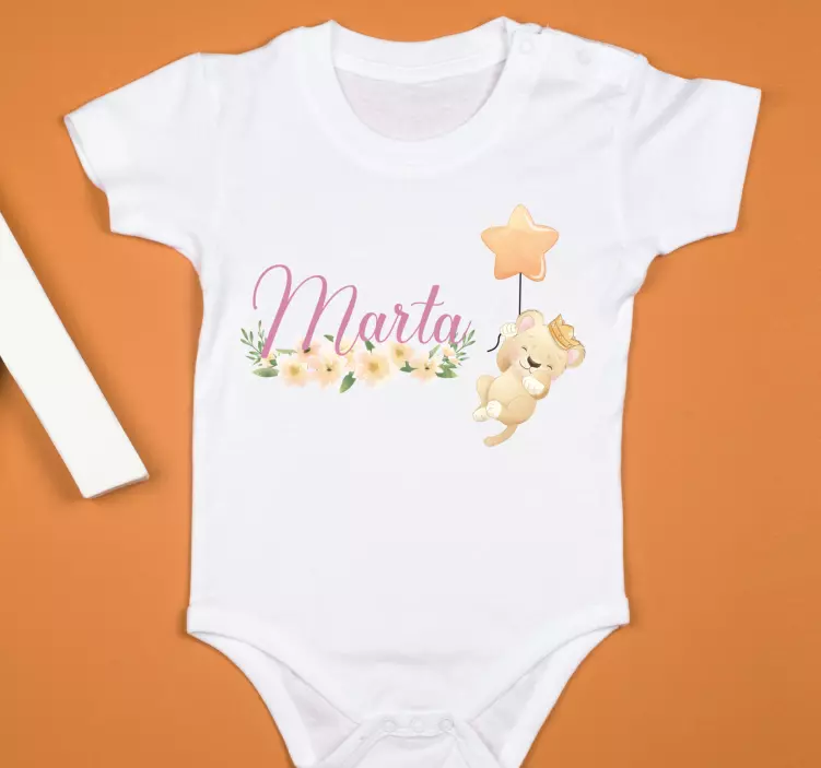 Hivatkozás: T5219Ez a bájos dizájn egy aranyos medvét ábrázol, aki egy csillag léggömböt tart, finom virágos elemekkel kiegészítve. A 'Marta' név elegánsan be van építve a műalkotásba, örömteli és személyre szabott érintést adva, ami tökéletes a babaruhákhoz.