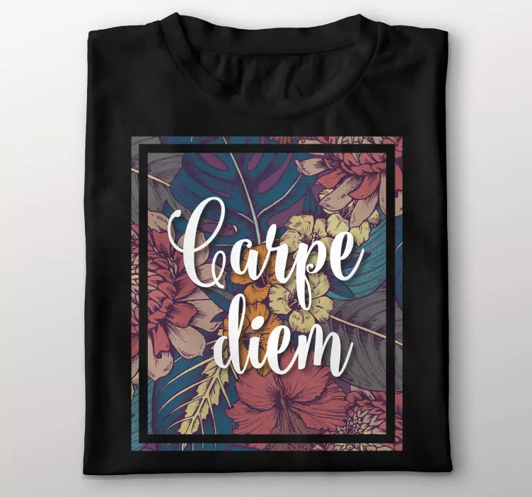 Hivatkozás: T4902Ez a vibráló dizájn a 'Carpe Diem' kifejezést színes virágos elemekkel ötvözi. A fekete háttér kiemeli a merész és vidám árnyalatokat, így felemelő vizuális élményt teremt. Tökéletes azok számára, akik értékelik a szépség és a motiváló kifejezés keverékét.