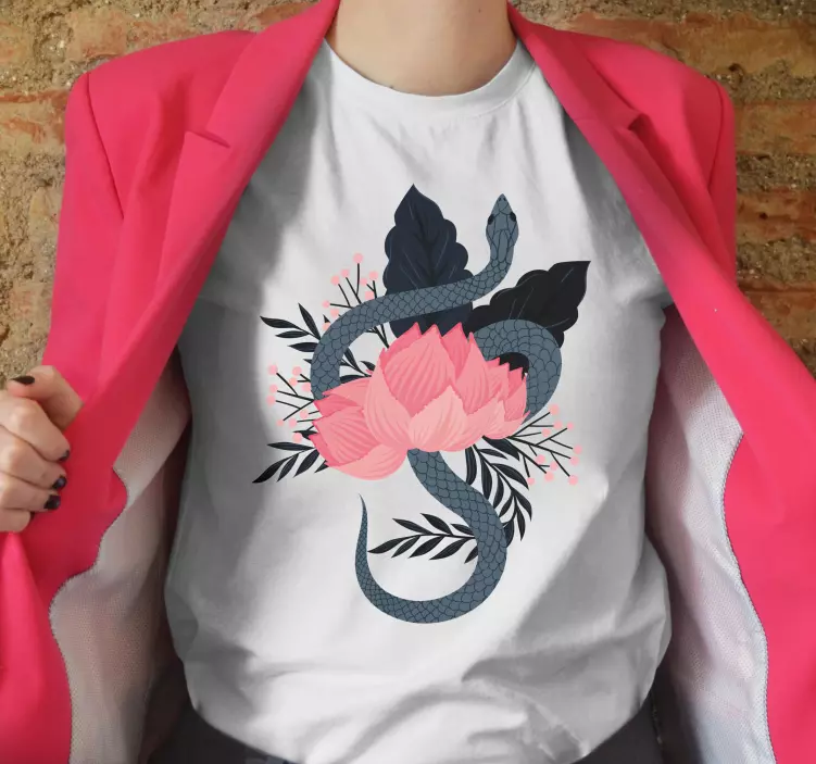 Fedezd fel az egyediséget a Kígyó és virág motívumos póló által! A modern és stilizált dizájn, amely magában foglalja a kígyót, lótuszt, leveleket és virágszirmokat rózsaszín és fekete színekben, igazán lenyűgöző látványt nyújt. A természet inspirálta minták tökéletes harmóniában egyesítik a színeket és formákat, így ez a póló nemcsak ruhadarab, hanem egy műalkotás is, amely a stílust és a karaktert képviseli.