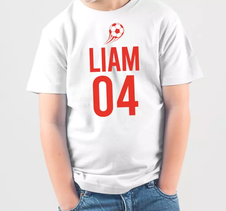 Hivatkozás: T4113Ez a dizájn egy élénk foci témát mutat be, kiemelve a 'Liam' nevet a '04' számmal. A színek figyelemfelkeltőek, a merész vörösök fehér háttérrel kontrasztban állnak, tökéletes fiatal foci rajongók számára.