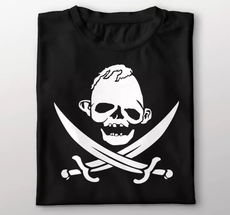 Hivatkozás: T4941Ez a figyelemfelkeltő dizájn egy rémisztő kalóz koponyát ábrázol, amelyik egy csintalan mosollyal és keresztbe tett kardokkal rendelkezik. A merész fekete háttér előtt a feltűnő fehér grafikák Halloween témákat idéznek, így tökéletesek szórakoztató és játékos alkalmakra. Ideális azok számára, akik szeretik a kalandos stílusokat.