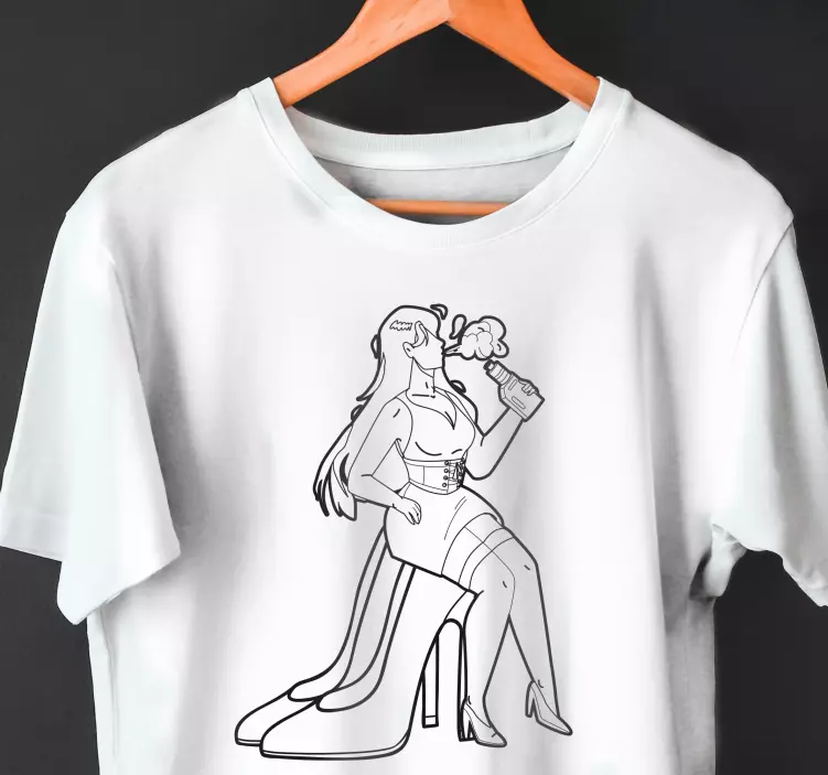 Fedezze fel a Stílusos magas sarkú hangulat póló egyedi dizájnját, amely egy női sziluettet ábrázol, kézzel rajzolt stílusban. A pólón található vázlat egy magabiztos nőt ábrázol, aki éppen egy koktél mellett dohányzik vagy vape-ol, így a divatos stílus és a modern életérzés tökéletes összhangot alkot. Ez a különleges grafika ideális választás minden divatrajongónak!