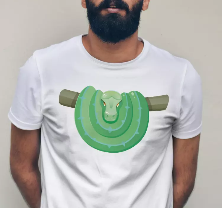 Fedezze fel a stílusos és egyedi Zöld kígyószerű mintás póló varázsát! Ez a póló egy különleges dizájnt képvisel, amelyben a boa és a kígyó motívumok játékosan keverednek egy elegáns, zöld háttérrel. A rajzfilm stílusú ábra garantáltan felhívja magára a figyelmet, így ez a póló nemcsak alkalmi viselet, hanem igazi divatnyilatkozat is!