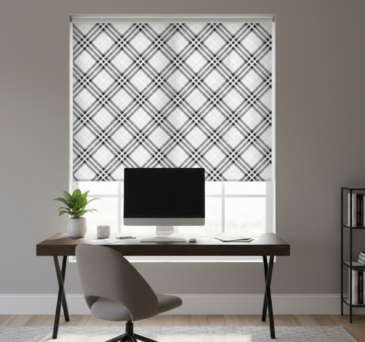 Fekete-fehér skót mintás redőnyök otthoni munkavégzés
