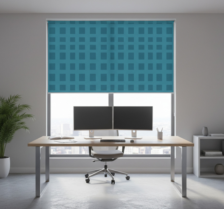 Kék négyzetmintás redőnyök otthoni munkavégzéshez