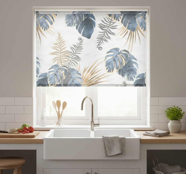 A Konyhai redőnyök kék trópusi mintával fehér háttérrel Redőnyök konyha könnyen alkalmazható bármilyen konyhában. Egyszerűen telepíthető, és a kívánt fényviszonyoknak megfelelően állítható. Ideális választás, ha szeretné megvédeni a helyiséget a közvetlen napfénytől, miközben megőrzi a magánéletét. Az ügyfelek különböző textúrájú rolókat választhatnak, így testre szabhatják a redőnyöket saját igényeik szerint.
