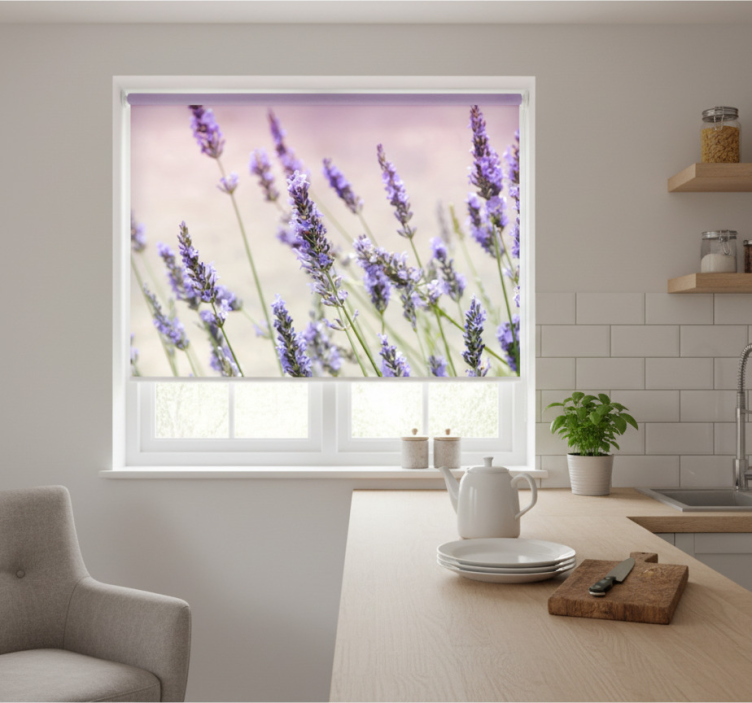 Lila virágcsokor redőnyök konyha