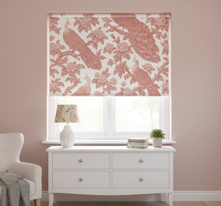 Rózsaszín redőnyök textil pávás mintával