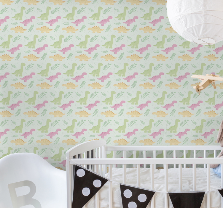 A Pasztell dinoszaurusz minta Tapéta Dinoszauruszok terv grafikusan dinoszauruszokat, dínókat, rajzfilmeket, pasztell színeket és aranyos mintákat tartalmaz, ideális gyerekek számára. A tapéta játékos és inspiráló, és kiváló választás a gyerekszoba vagy játékszoba dekorációjához.
