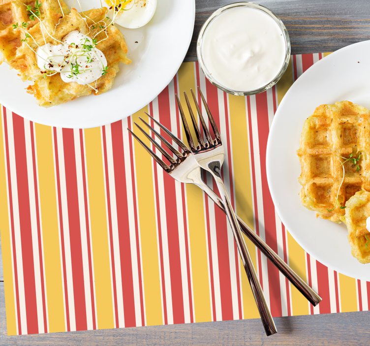 Hivatkozás: M4636Fényes és színes csíkos minta, amely sárga, piros és fehér vonalakat tartalmaz. Ez a vidám dizájn szórakoztató és élénk hangulatot kölcsönöz bármilyen környezetnek, tökéletes gyermekek összejöveteleire vagy laza családi étkezésekhez, fokozva az étkezési élményt élénk színeivel.