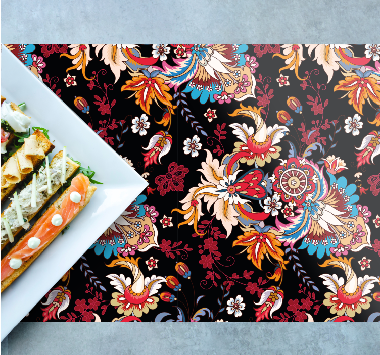 Hivatkozás: M5140Ez a lenyűgöző dizájn gazdag virágmintával rendelkezik, amely részletes kidolgozásaival és élénk színeivel a sötét háttér előtt tűnik fel. Az díszes elemek eleganciát és eredetiséget sugallnak, így ideális választás azok számára, akik egyedi stílusukkal szeretnék feldobni a teret.
